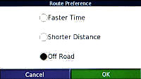 > Route Preference > Off Road > OK > Back (2).
